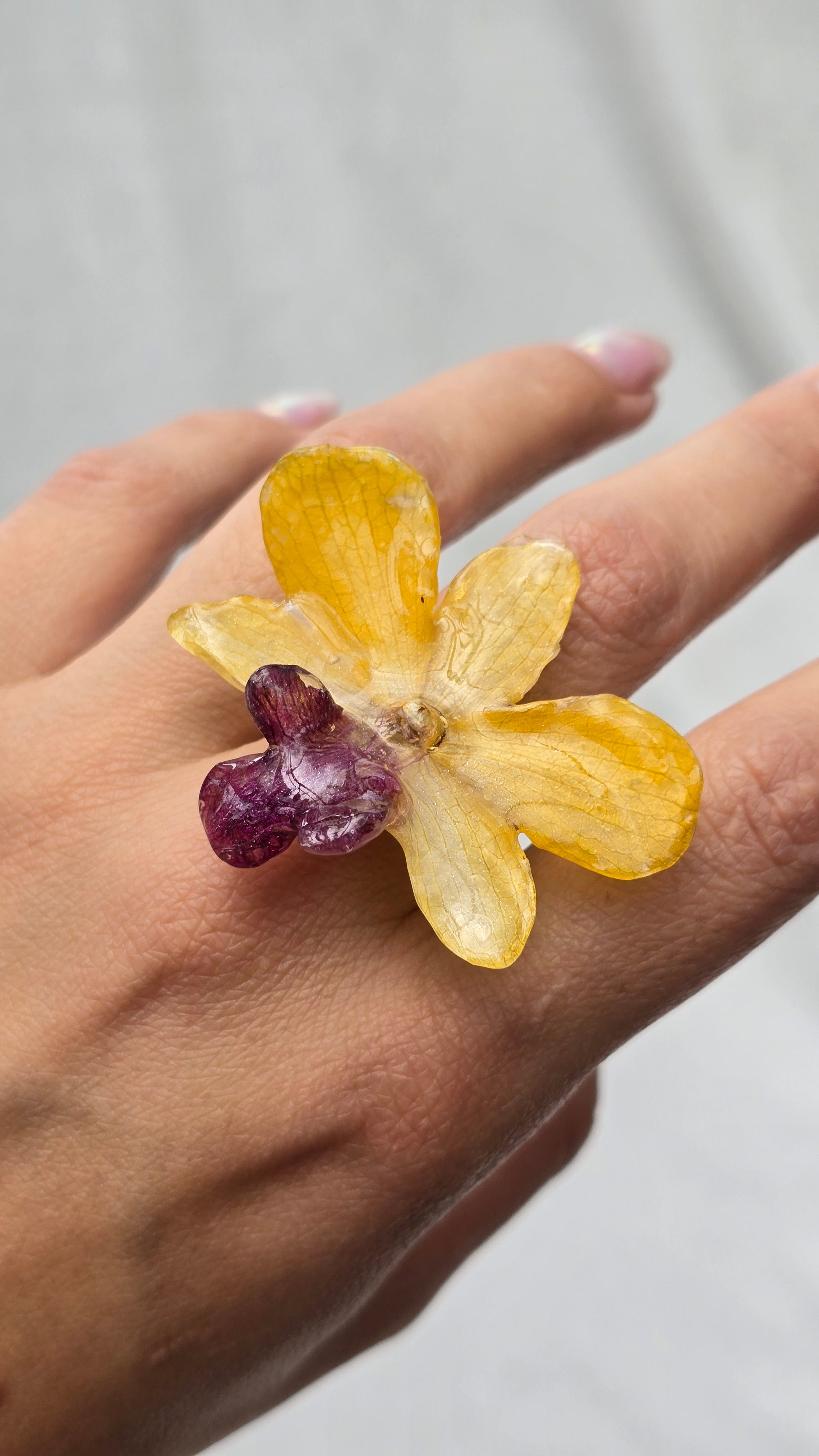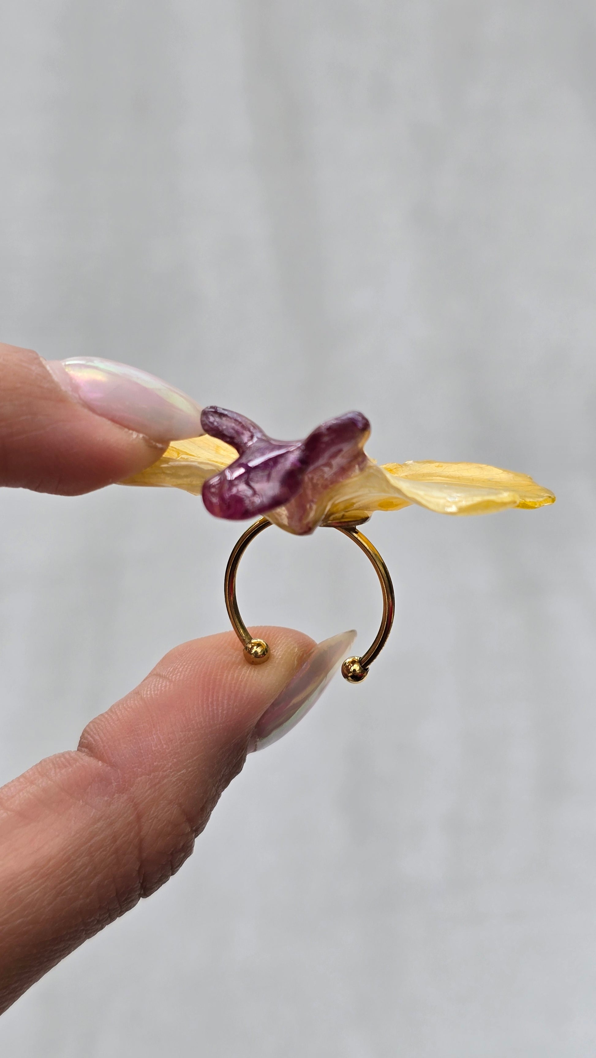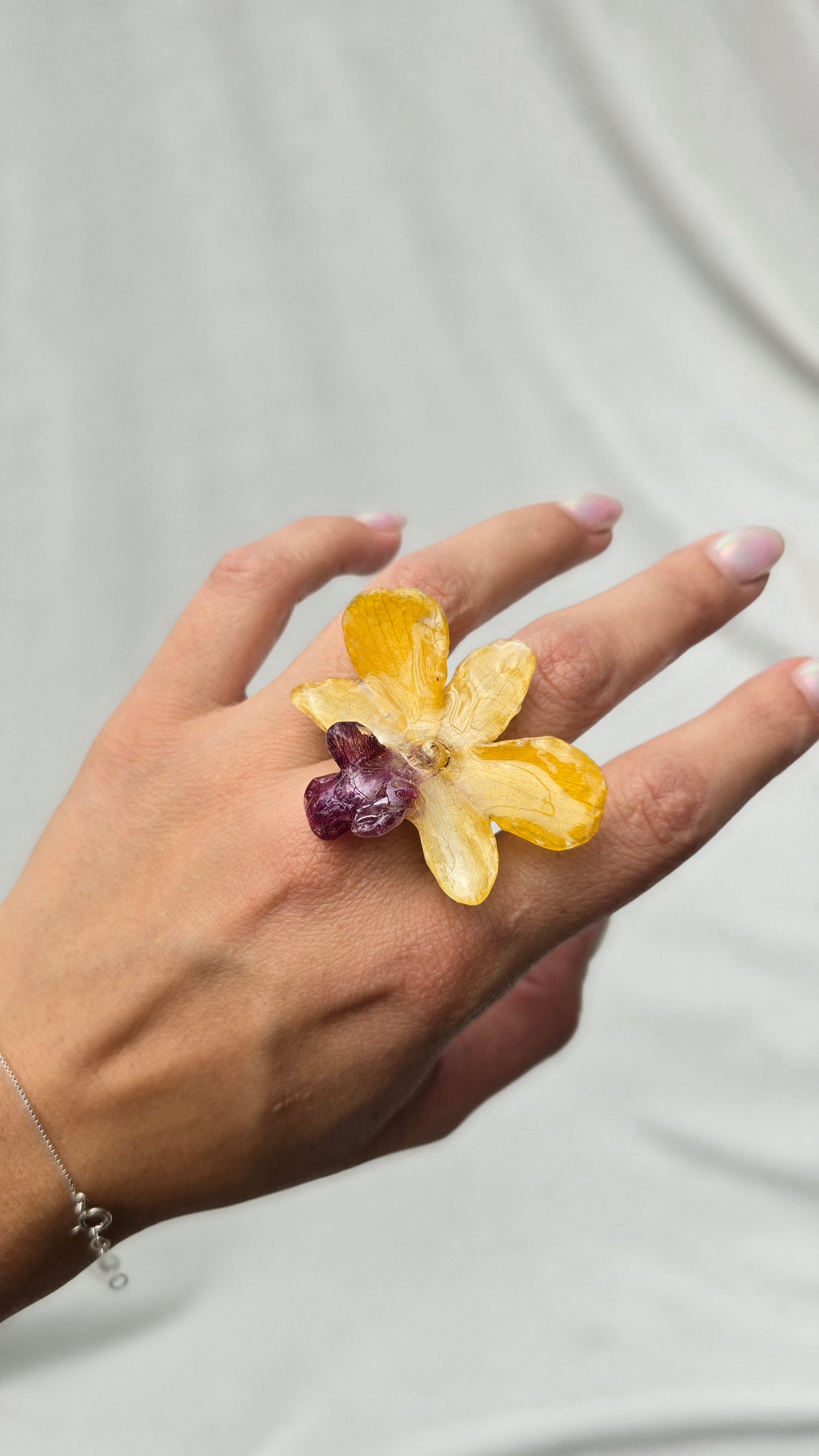 Dimensiones de la flor de 4 cm de alto por 5 cm de ancho y un peso de 4 gramos aproximadamente, anillo graduable.