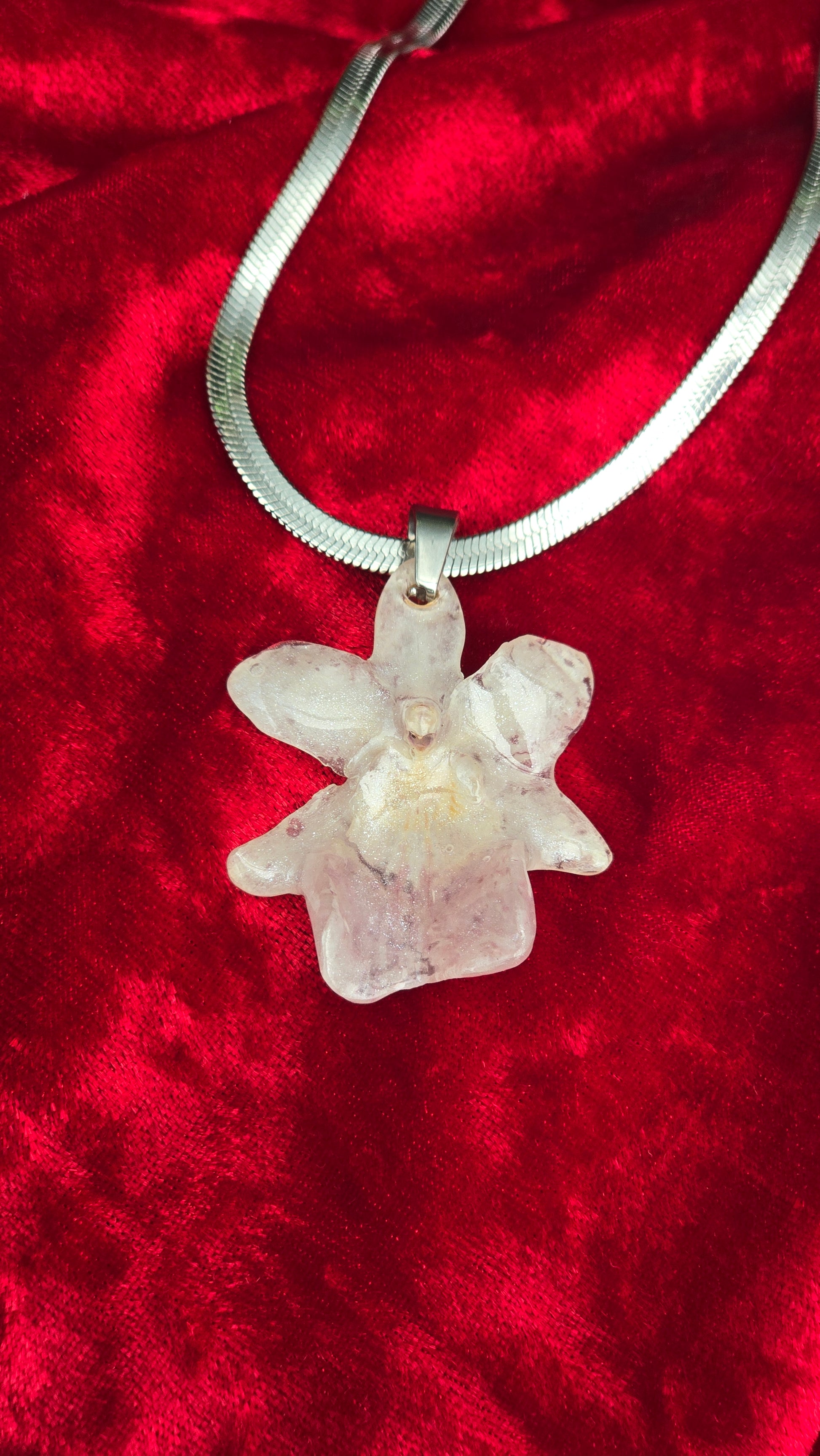 Dimensiones de la flor de 4 cm de alto por 3 cm de ancho y un peso de 9 gramos (cadena y flor) aproximadamente, medidas de la cadena 45 cm de largo.