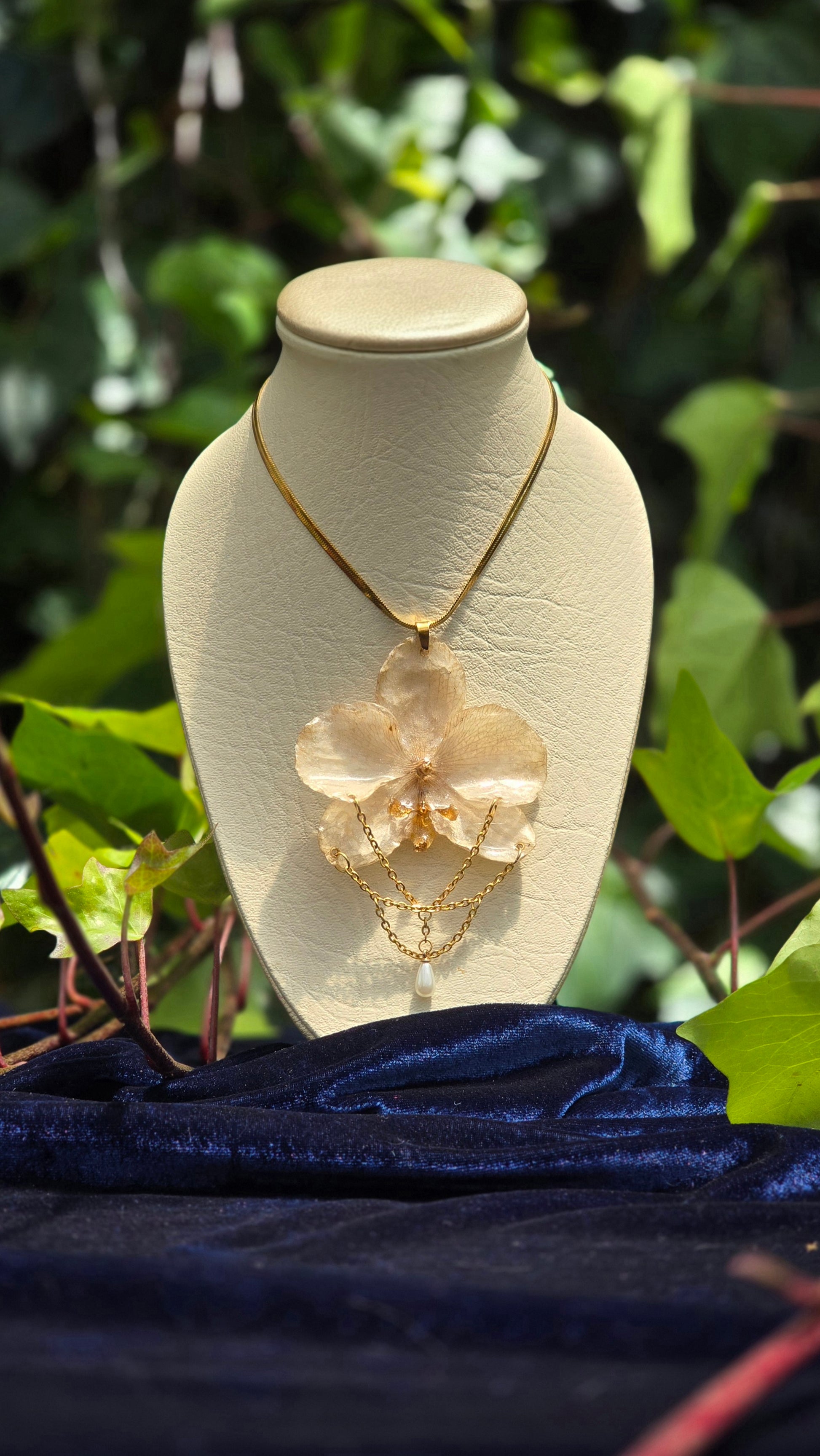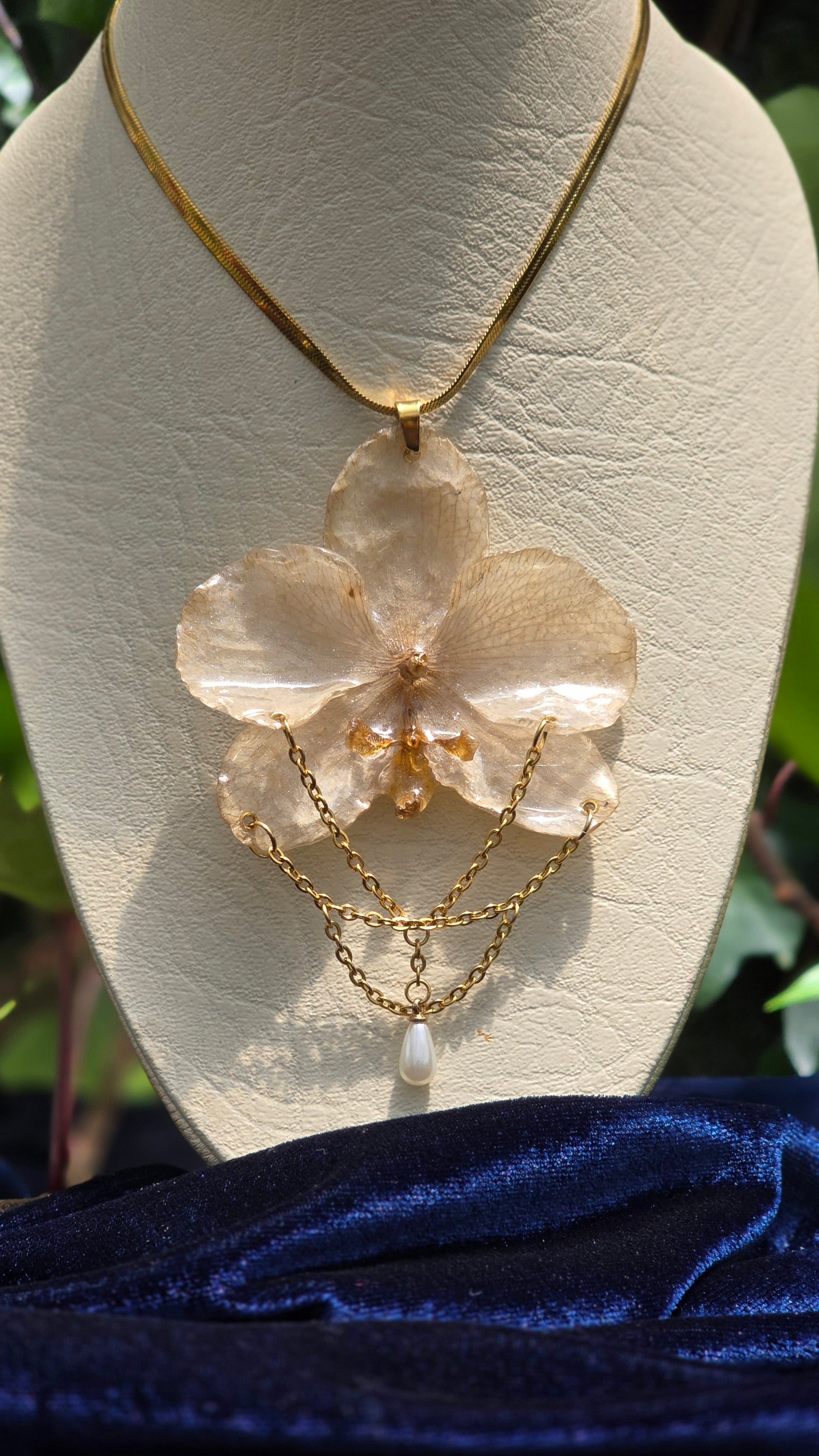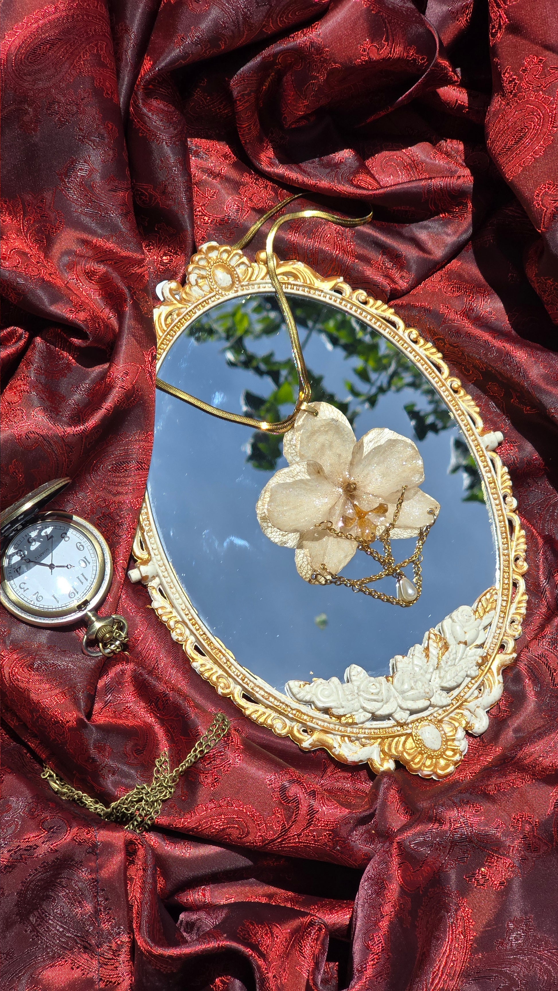 Dimensiones de la flor de 10 cm de alto por 7 cm de ancho y un peso de 16 gramos (cadena y flor) aproximadamente, medidas de la cadena 45 cm de largo.