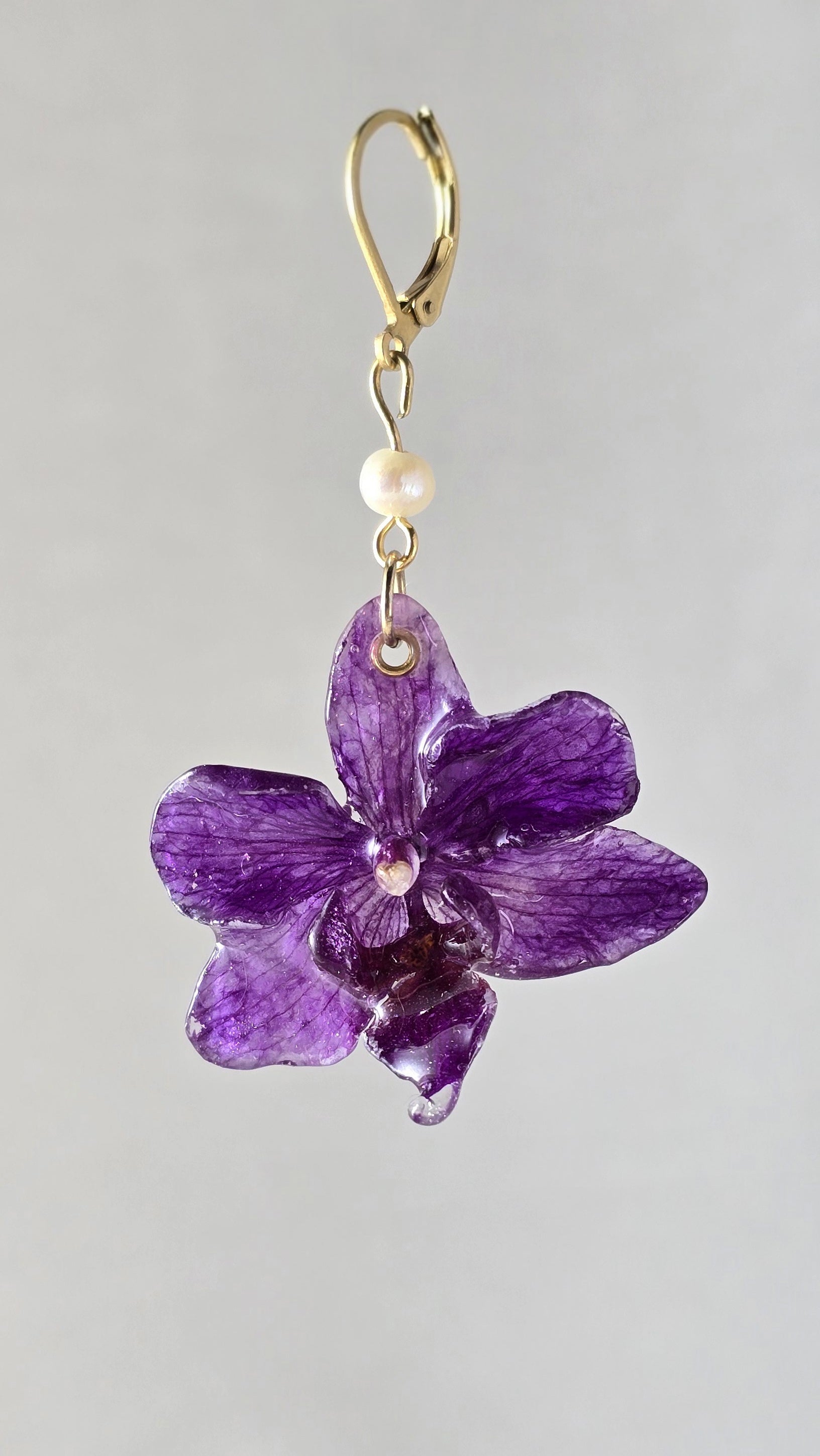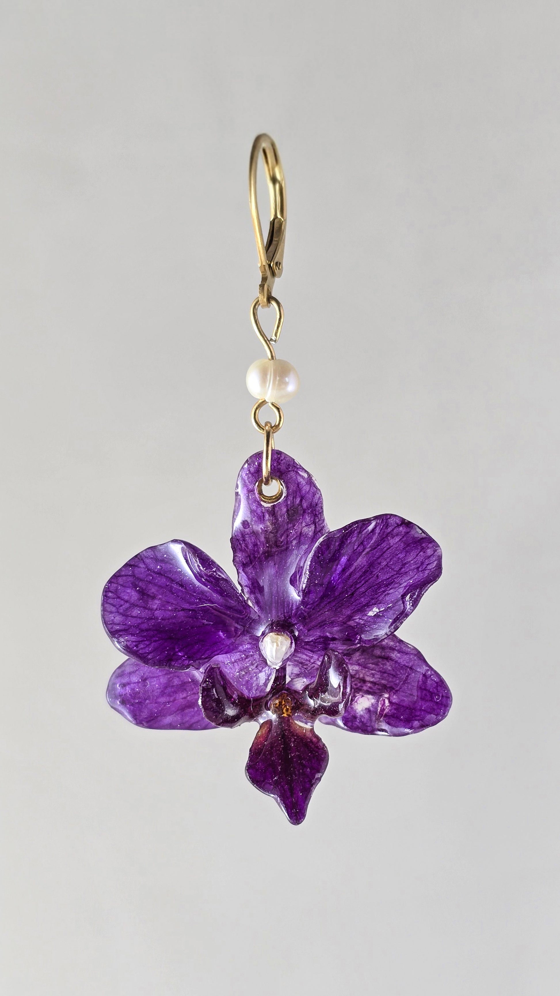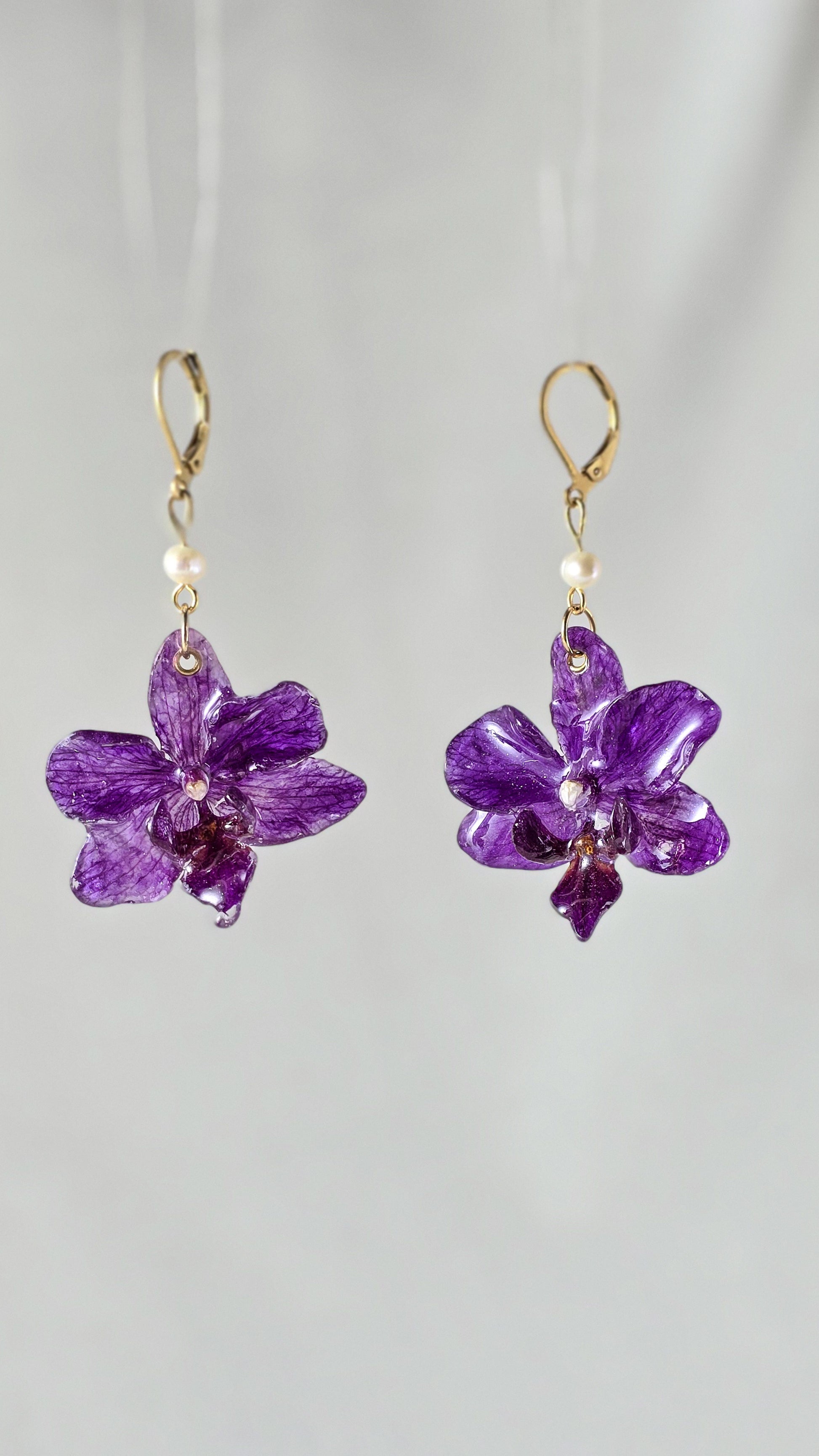 Aretes de orquídeas únicas, elaborados con flores naturales preservadas cuidadosamente para capturar su belleza y elegancia ✨️🌸 herrajes en acero inoxidable. Con unas dimensiones de 3.5 cm de alto por 3.5 cm de ancho (medidas con herrajes) y un peso de 5 gramos (par), (las medidas son aproximadas). Ofrece un ajuste cómodo y ligero, ideal para cualquier ocasión.