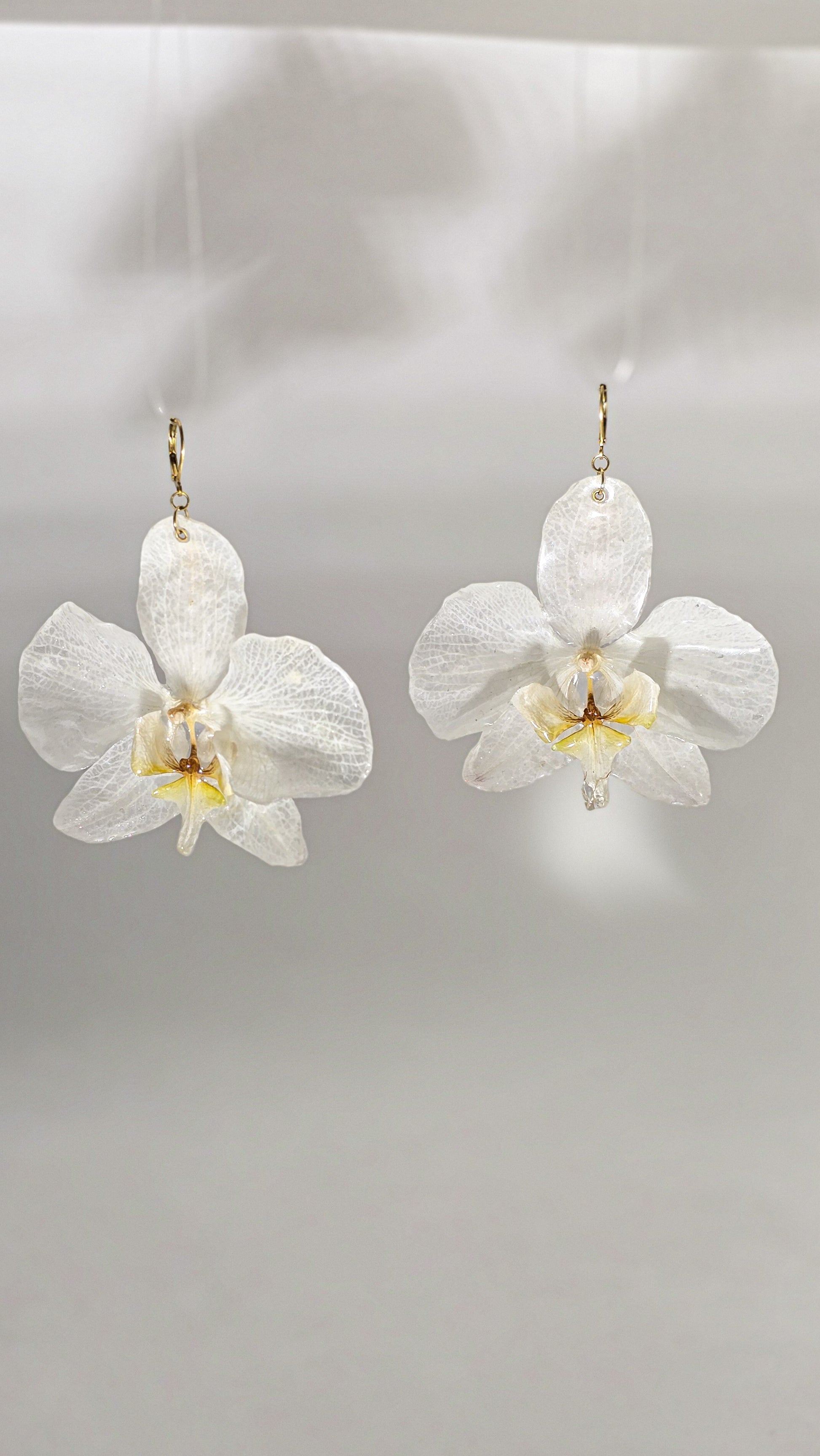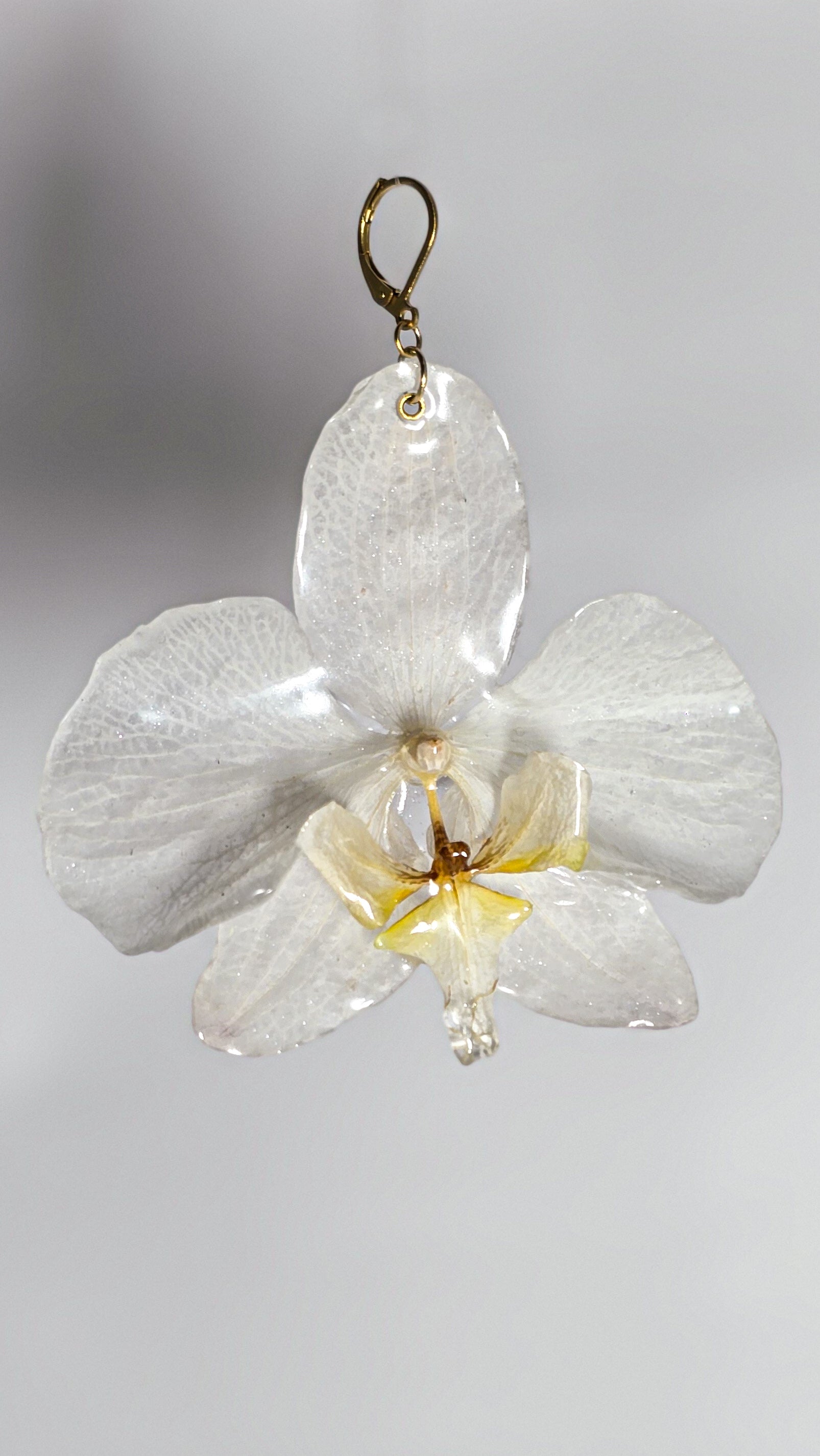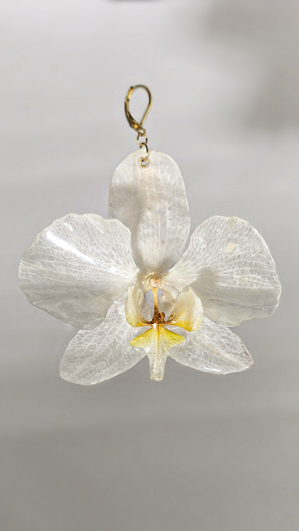 Aretes de orquídeas únicas, elaborados con flores naturales preservadas cuidadosamente para capturar su belleza y elegancia ✨️🌸 herrajes en acero inoxidable. Con unas dimensiones de 9 cm de alto por 8.5 cm de ancho (medidas con herrajes) y un peso de 20 gramos (par) (las medidas son aproximadas). Ofrece un ajuste cómodo y ligero, ideal para cualquier ocasión.