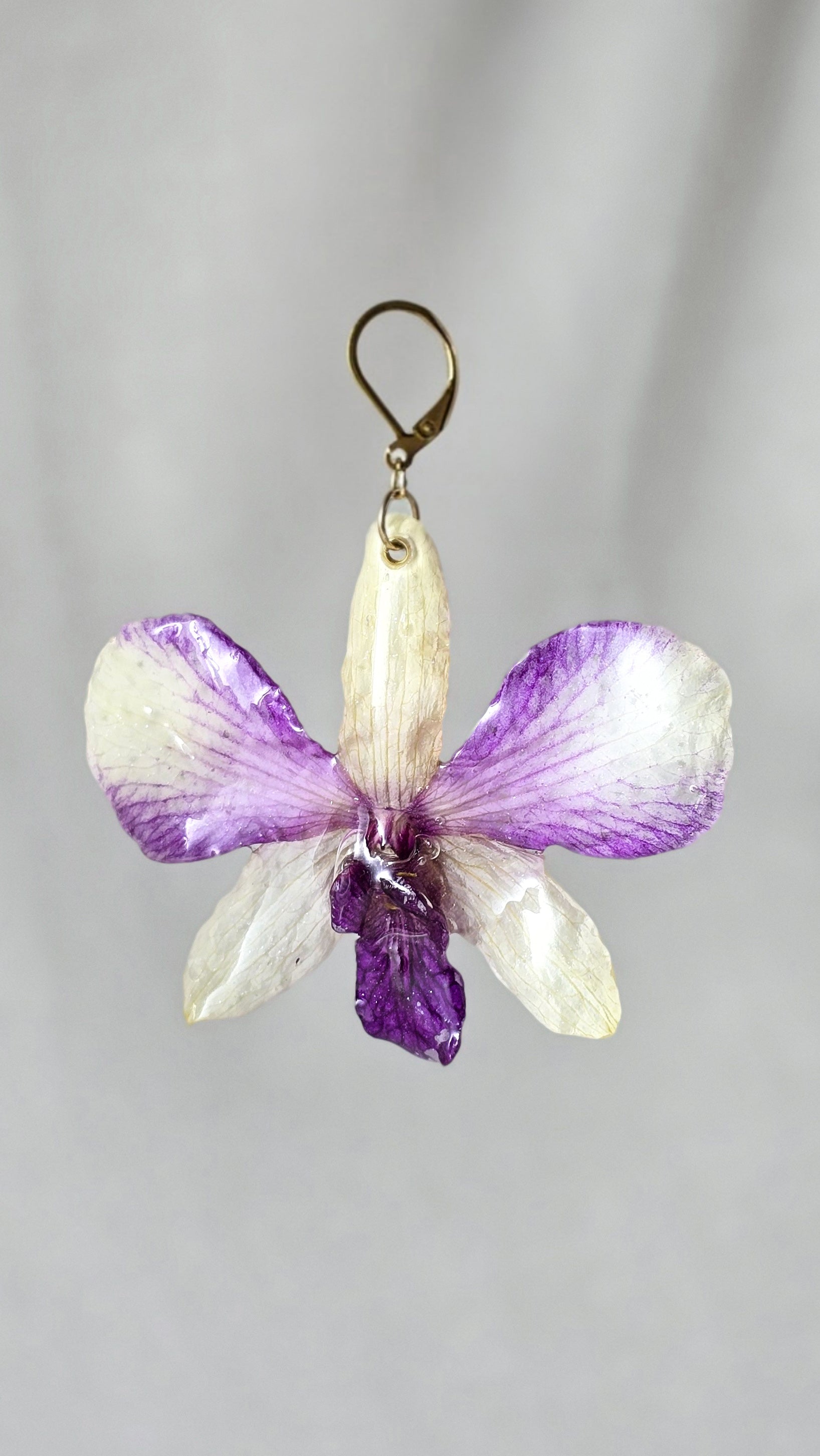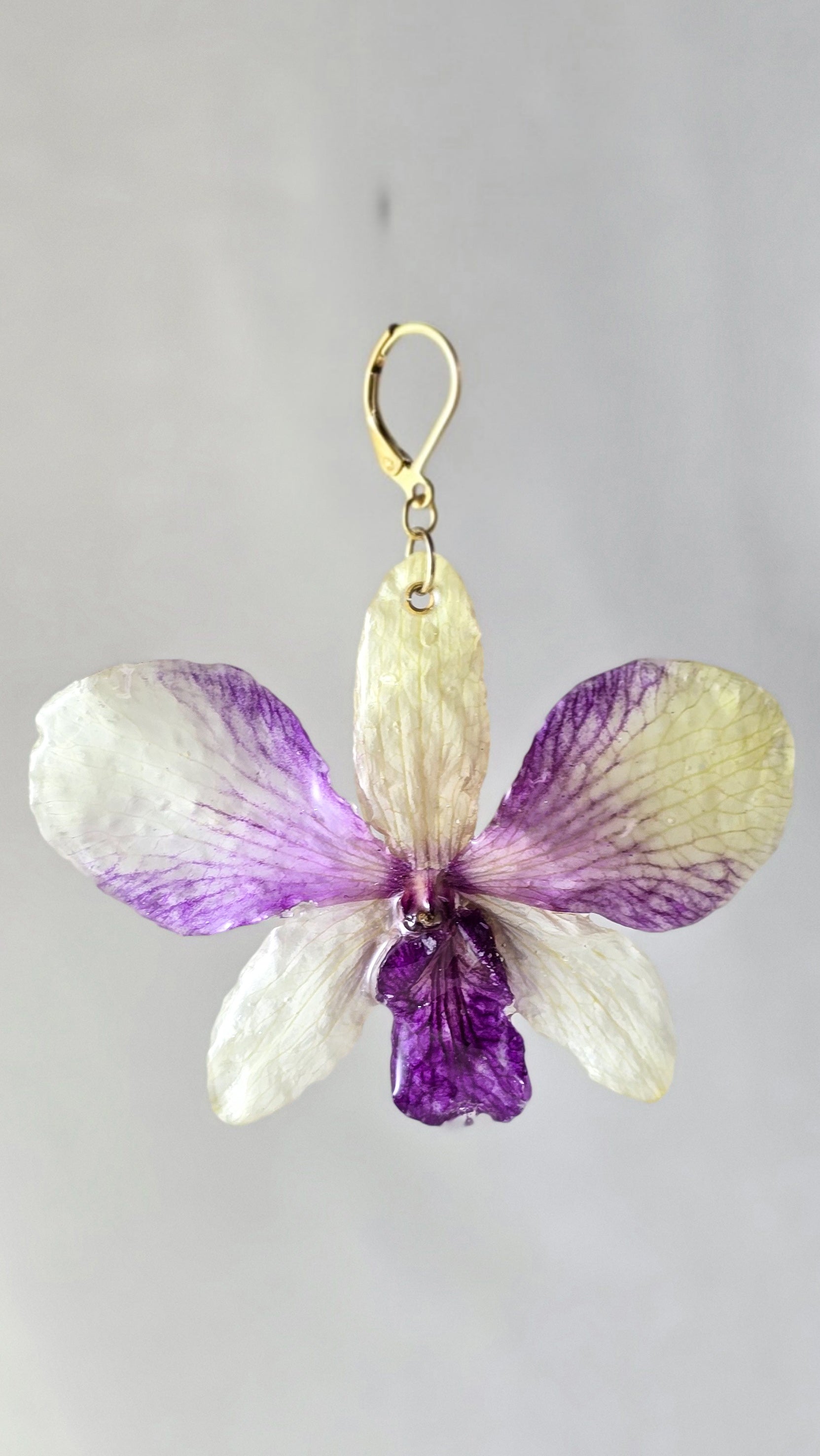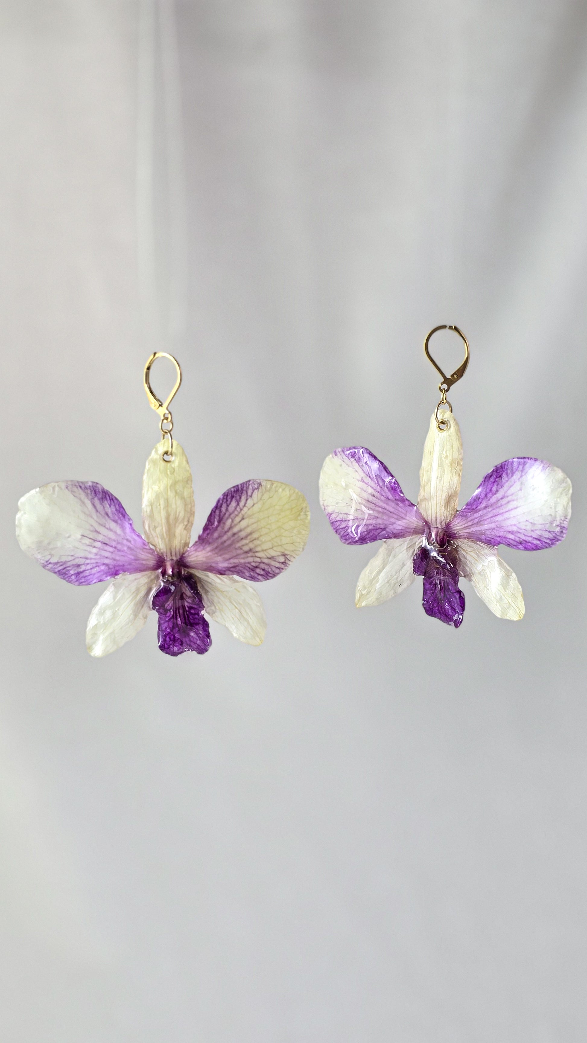 Aretes de orquídeas únicas, elaborados con flores naturales preservadas cuidadosamente para capturar su belleza y elegancia ✨️🌸 herrajes en acero inoxidable. Con unas dimensiones de 5 cm de alto por 6,5 cm de ancho (medidas con herrajes) y un peso de 11 gramos (par) (las medidas son aproximadas). Ofrece un ajuste cómodo y ligero, ideal para cualquier ocasión.