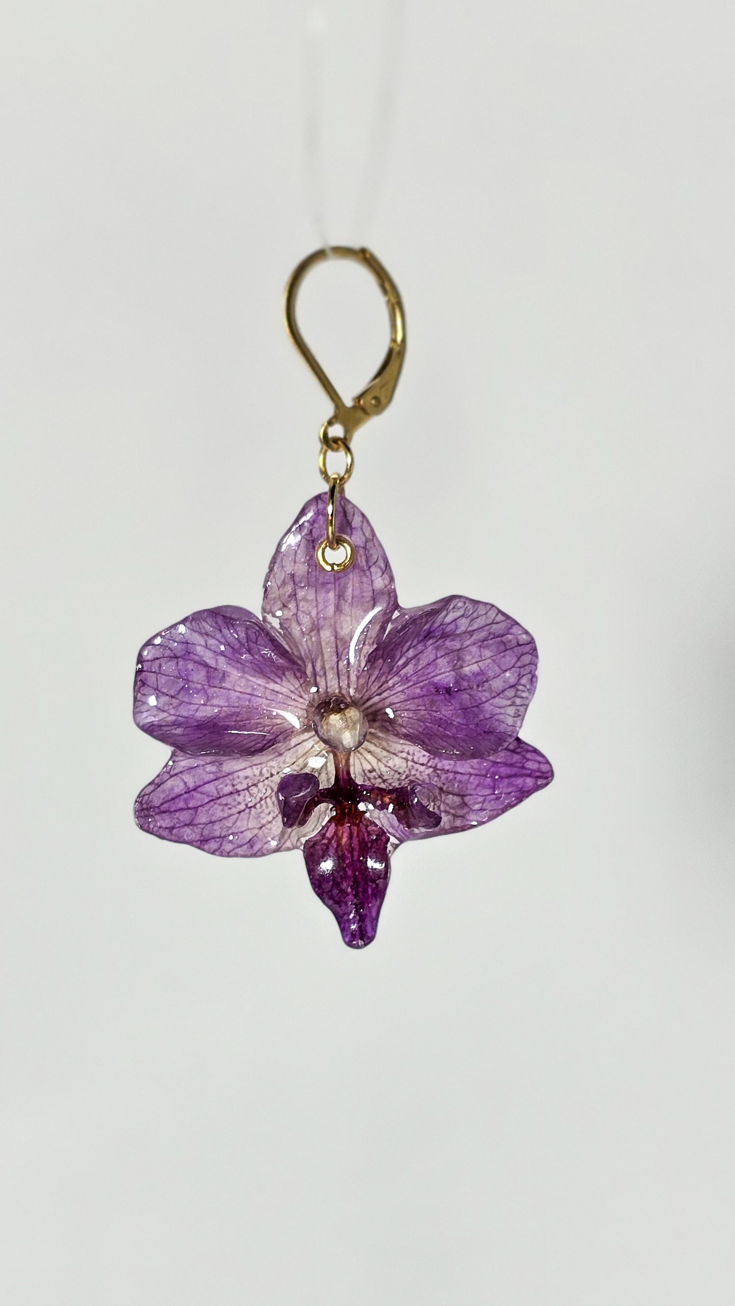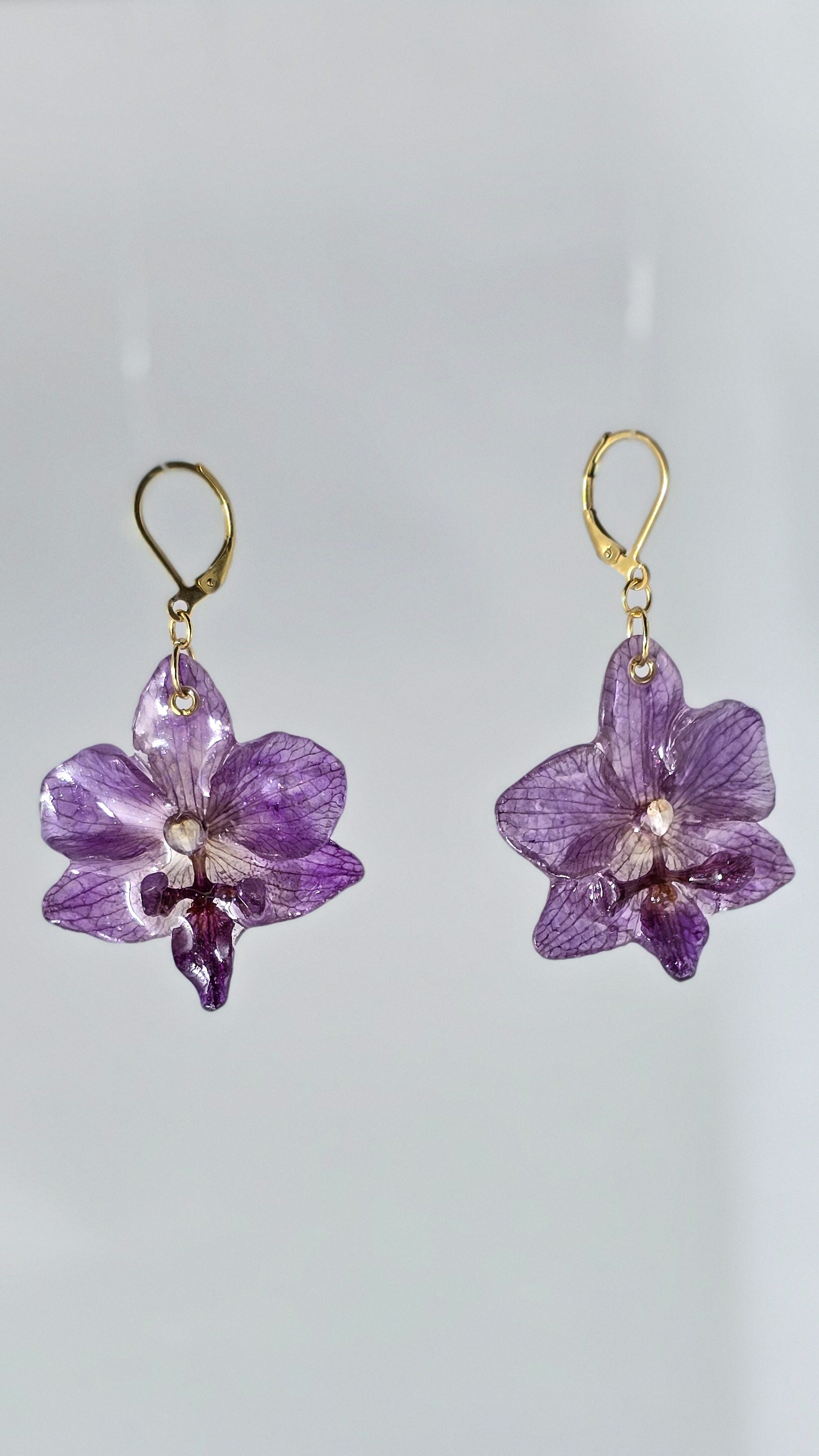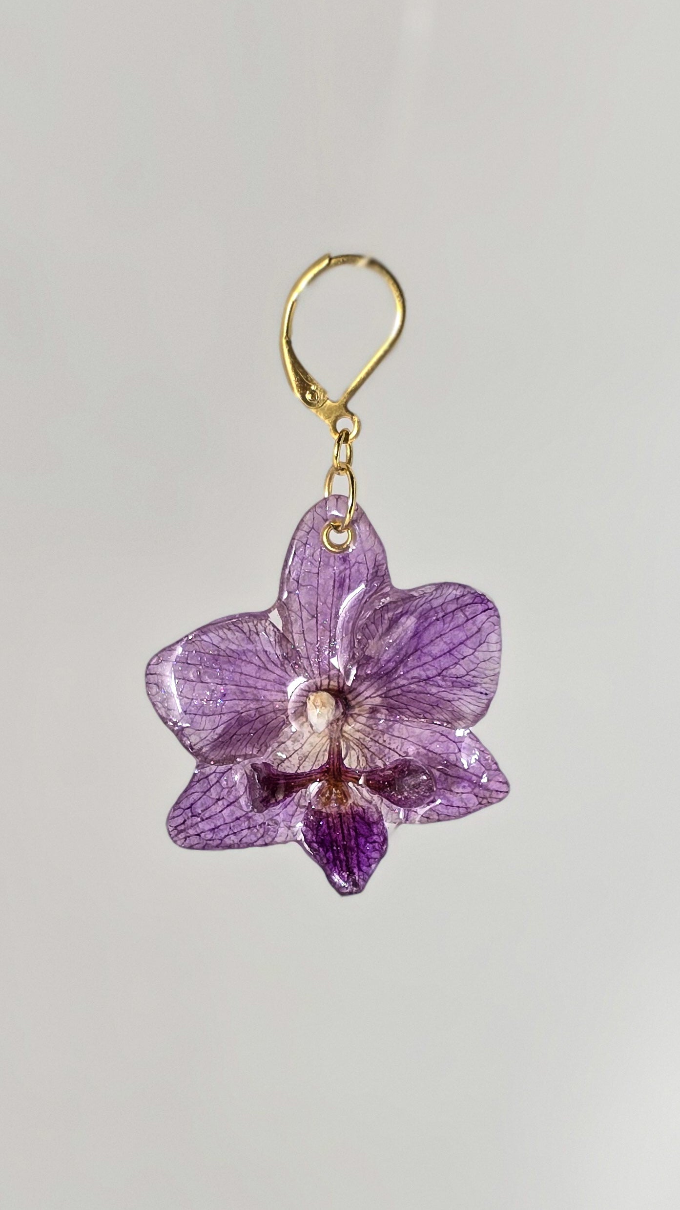 Aretes de orquídeas únicas, elaborados con flores naturales preservadas cuidadosamente para capturar su belleza y elegancia ✨️🌸 herrajes en acero inoxidable. Con unas dimensiones de 3.6 cm de alto por 3.4 cm de ancho (medidas con herrajes) y un peso de 4 gramos (par), (las medidas son aproximadas). Ofrece un ajuste cómodo y ligero, ideal para cualquier ocasión.