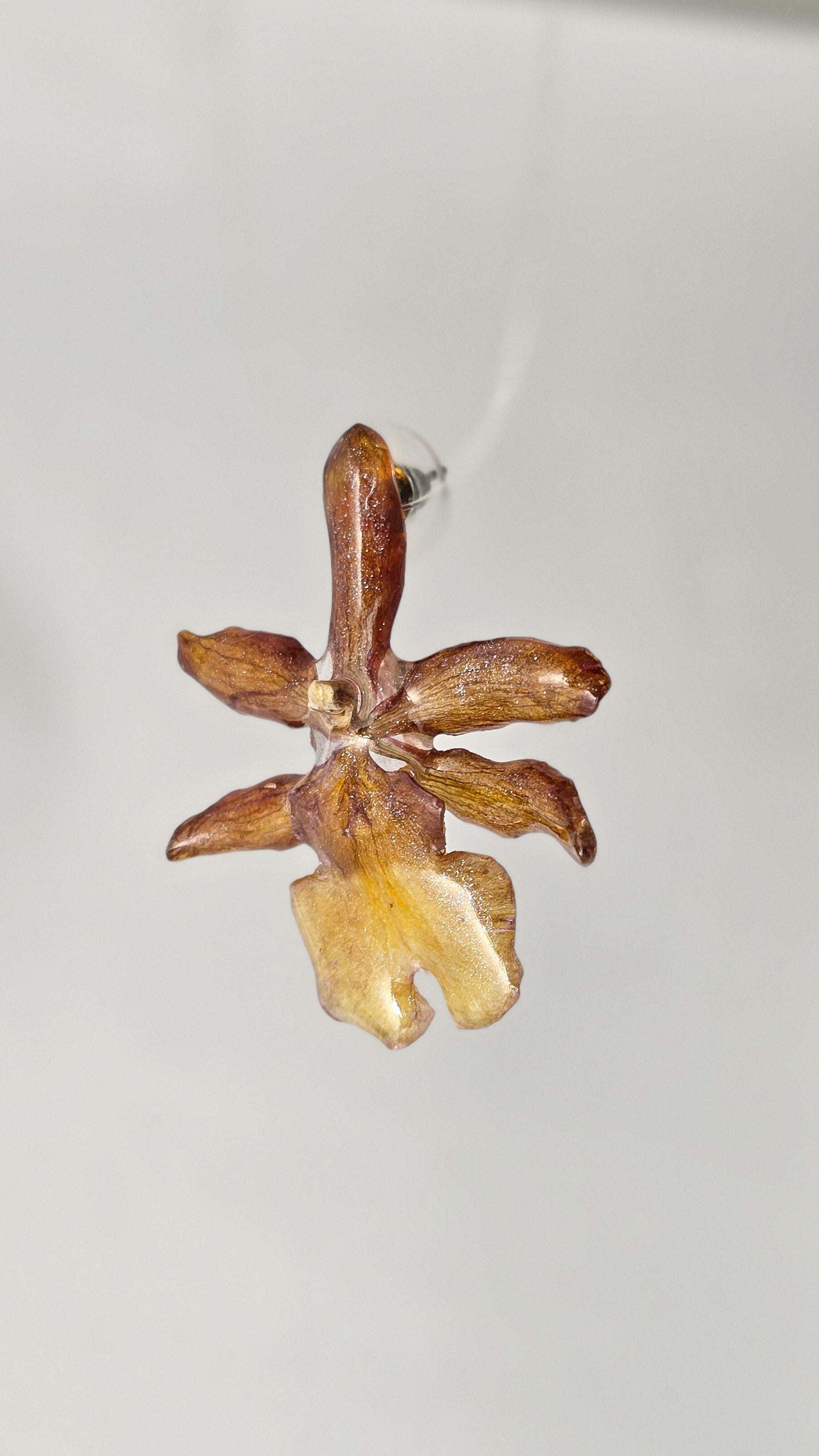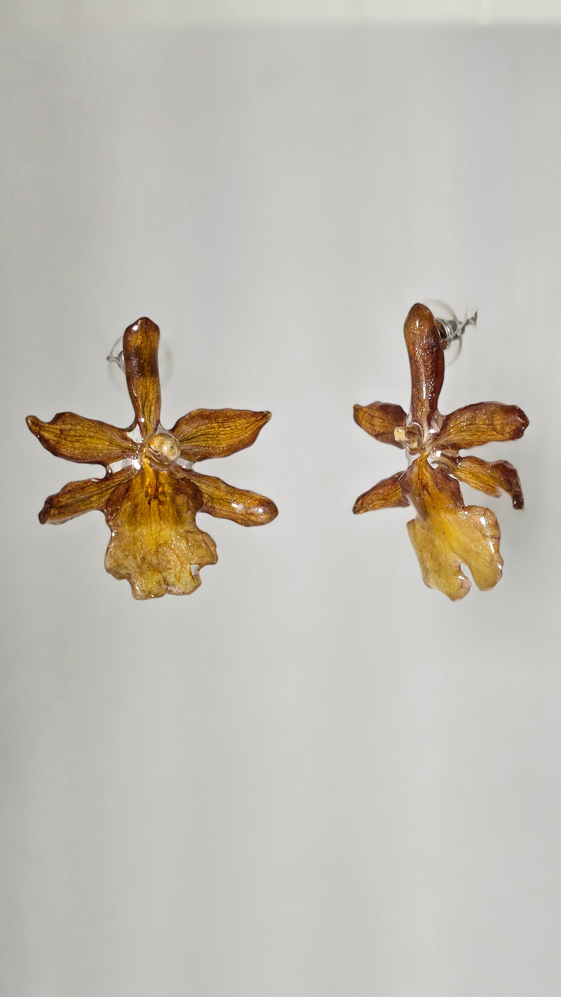 Aretes topitos de orquídeas únicas, elaborados con flores naturales preservadas cuidadosamente para capturar su belleza y elegancia ✨️🌸 herrajes en acero inoxidable. Con unas dimensiones de 4 cm de alto por 4 cm de ancho (medidas con herrajes) y un peso de 5 gramos (par). Ofrece un ajuste cómodo y ligero, ideal para cualquier ocasión.