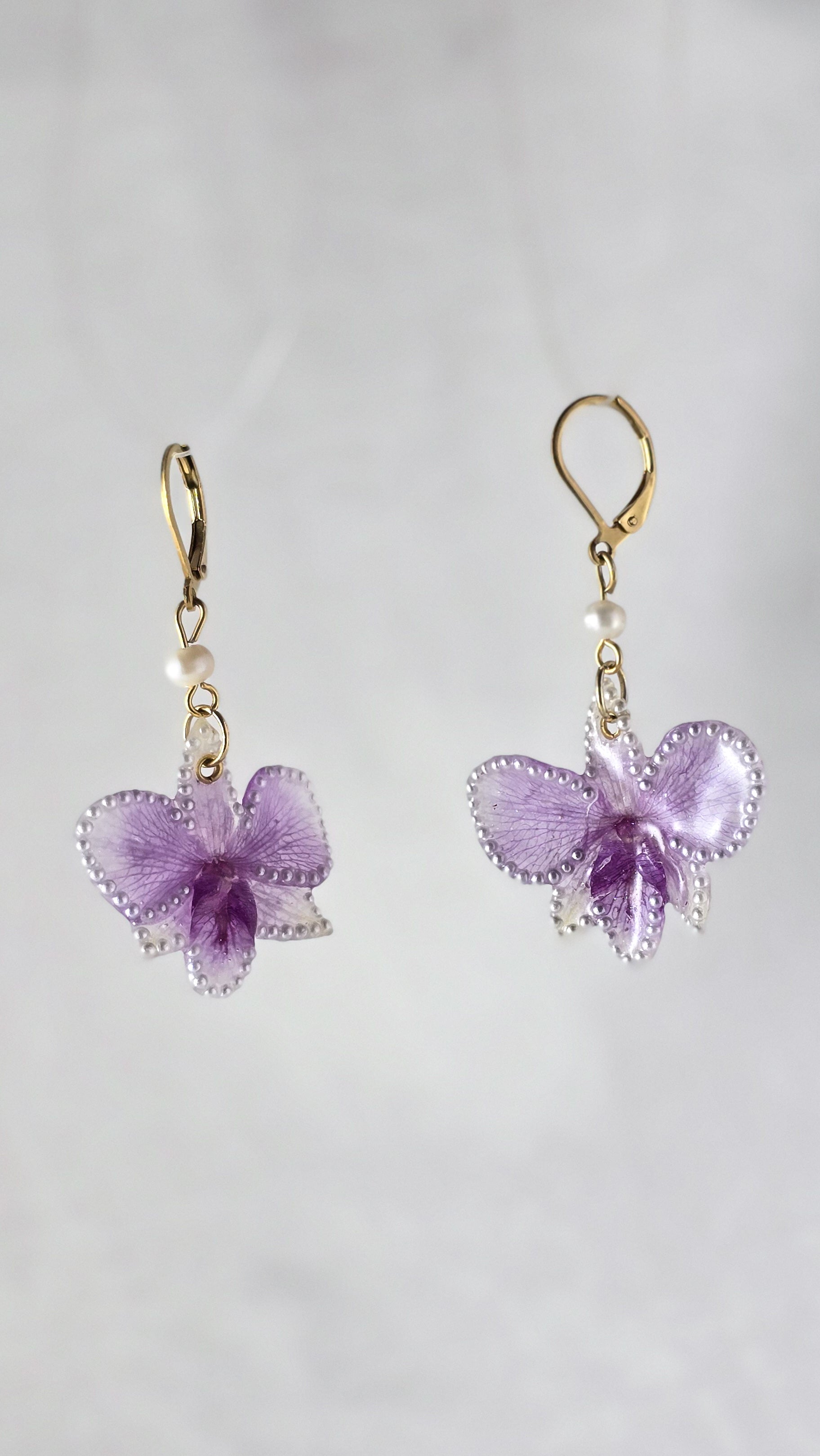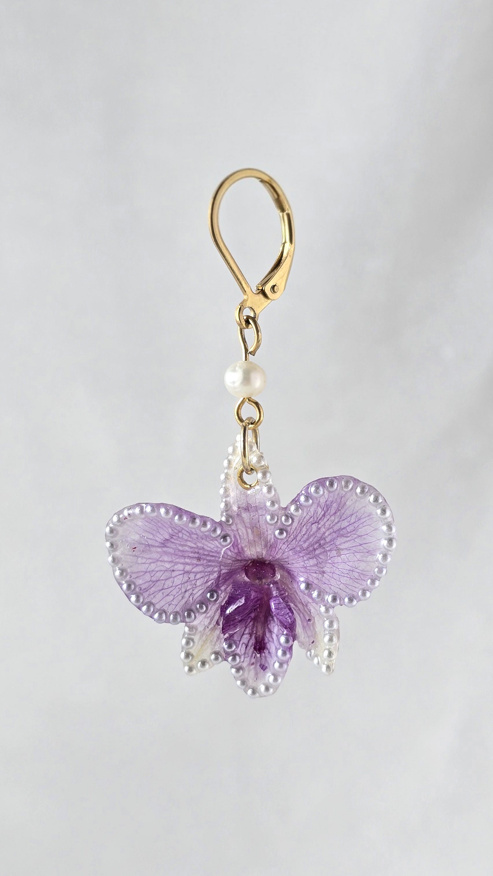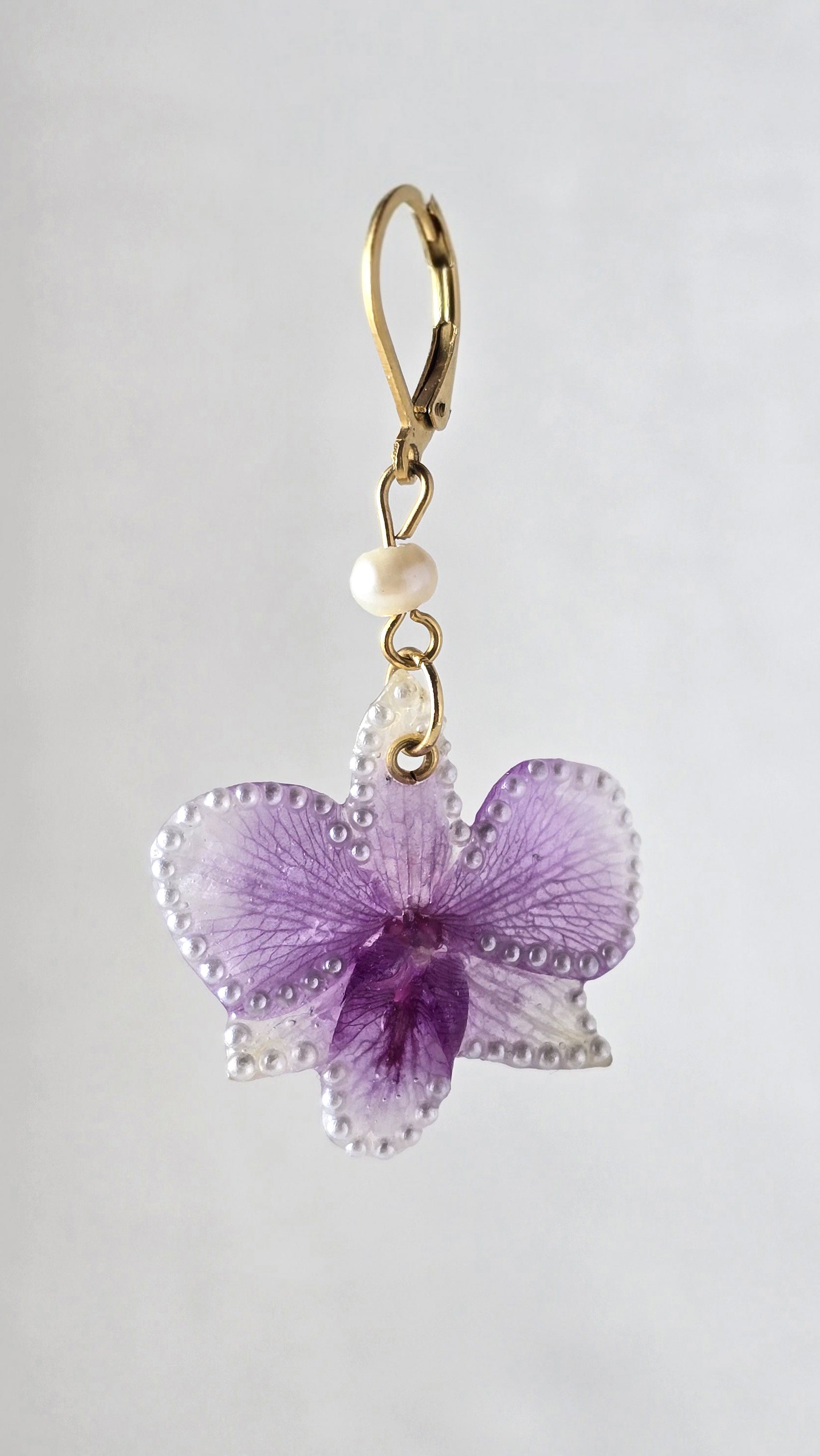 Aretes de orquídeas únicas, elaborados con flores naturales preservadas cuidadosamente para capturar su belleza y elegancia ✨️🌸 herrajes en acero inoxidable. Con unas dimensiones de 3 cm de alto por 3 cm de ancho (medidas con herrajes) y un peso de 3 gramos (par), (las medidas son aproximadas). Ofrece un ajuste cómodo y ligero, ideal para cualquier ocasión.