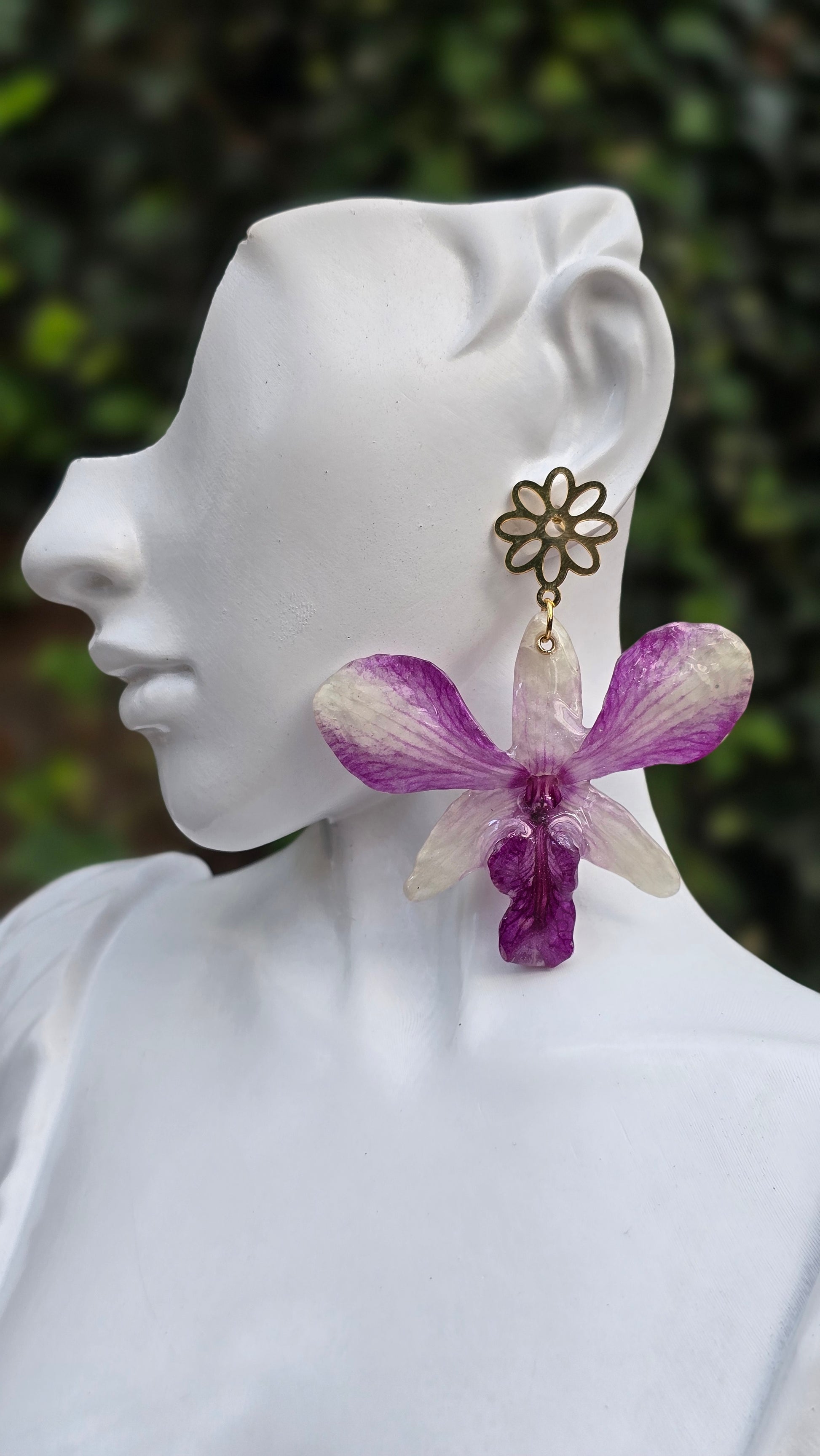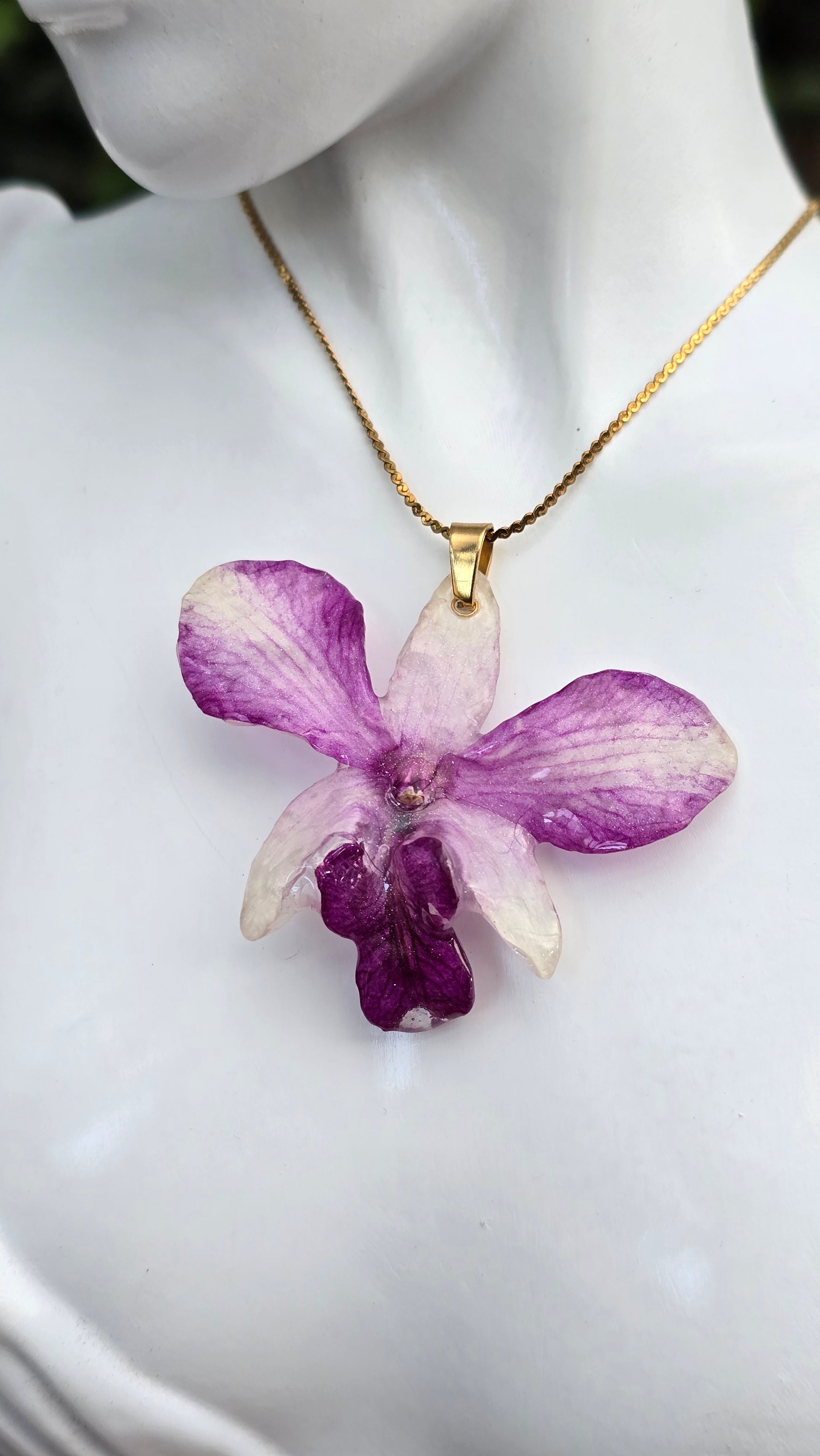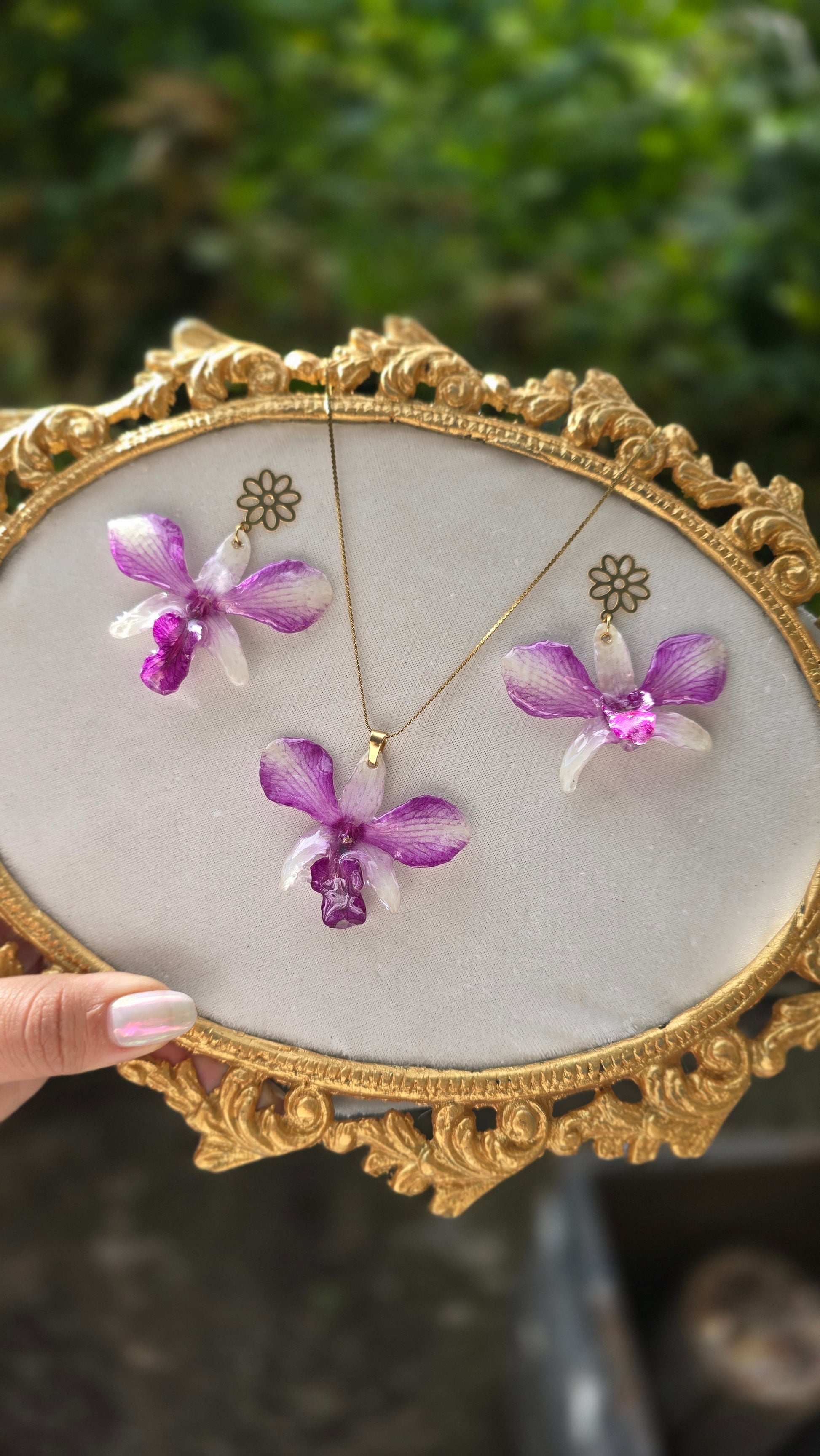 Collar y aretes con orquídeas Dendrobium reales.