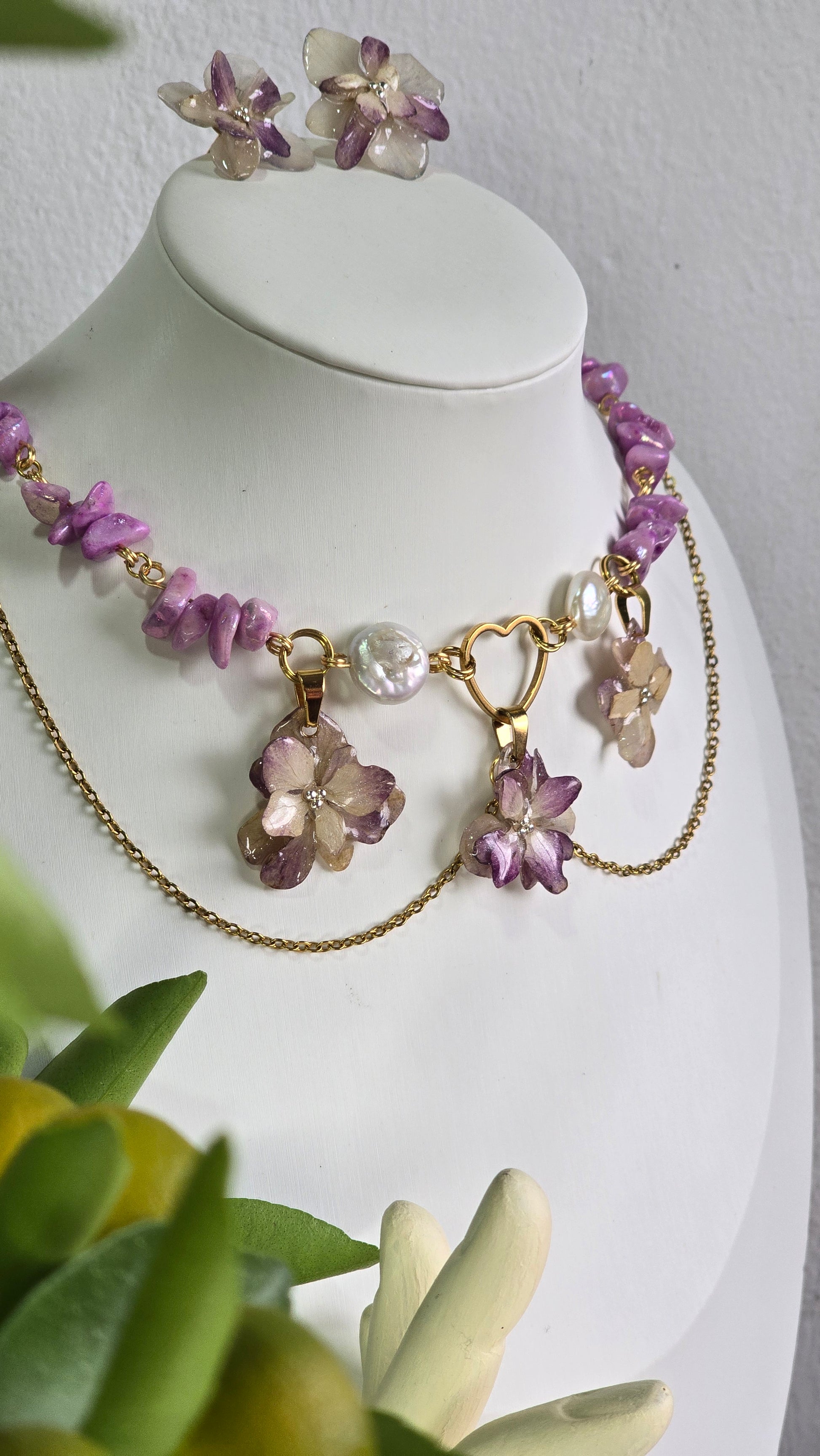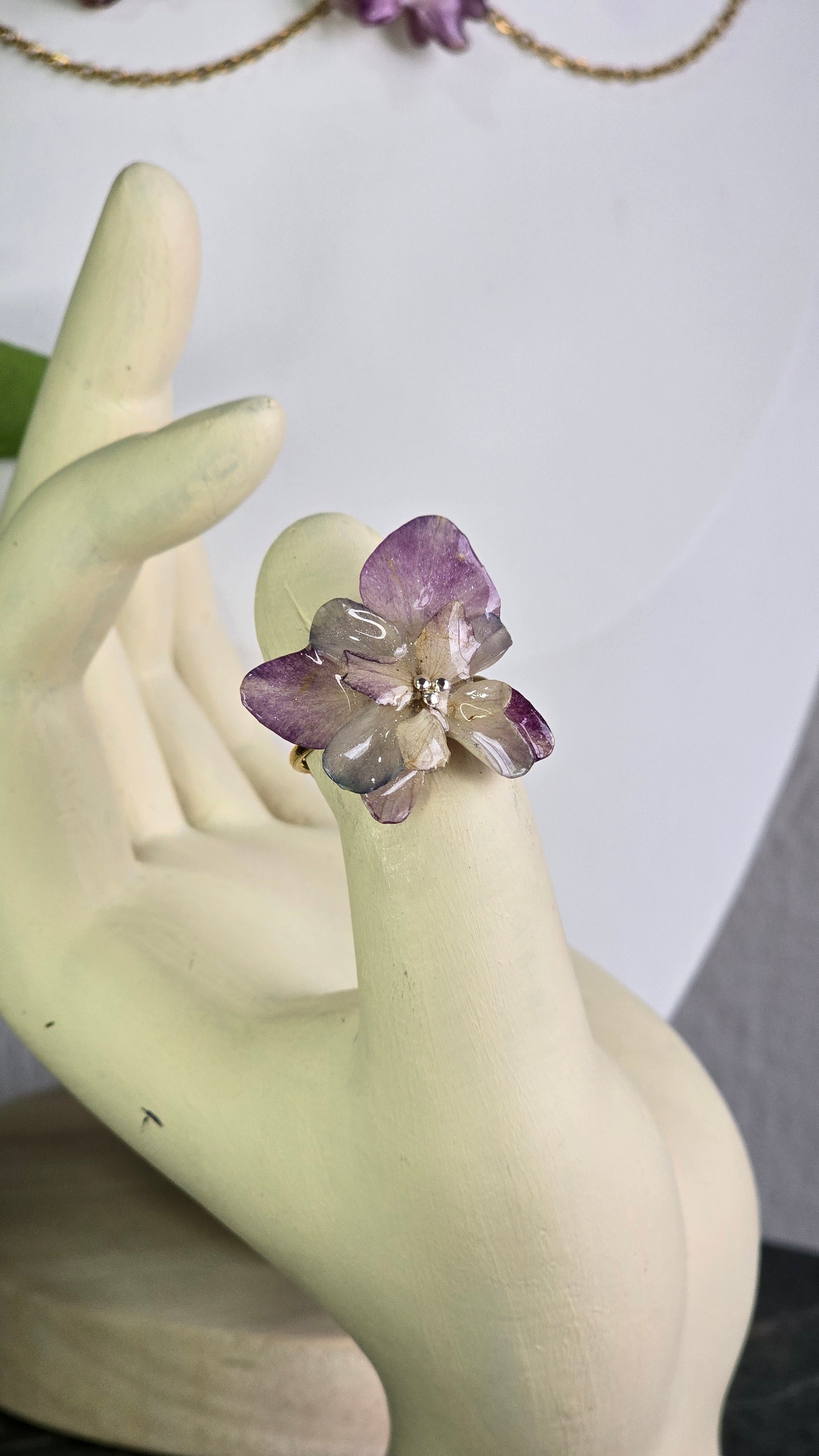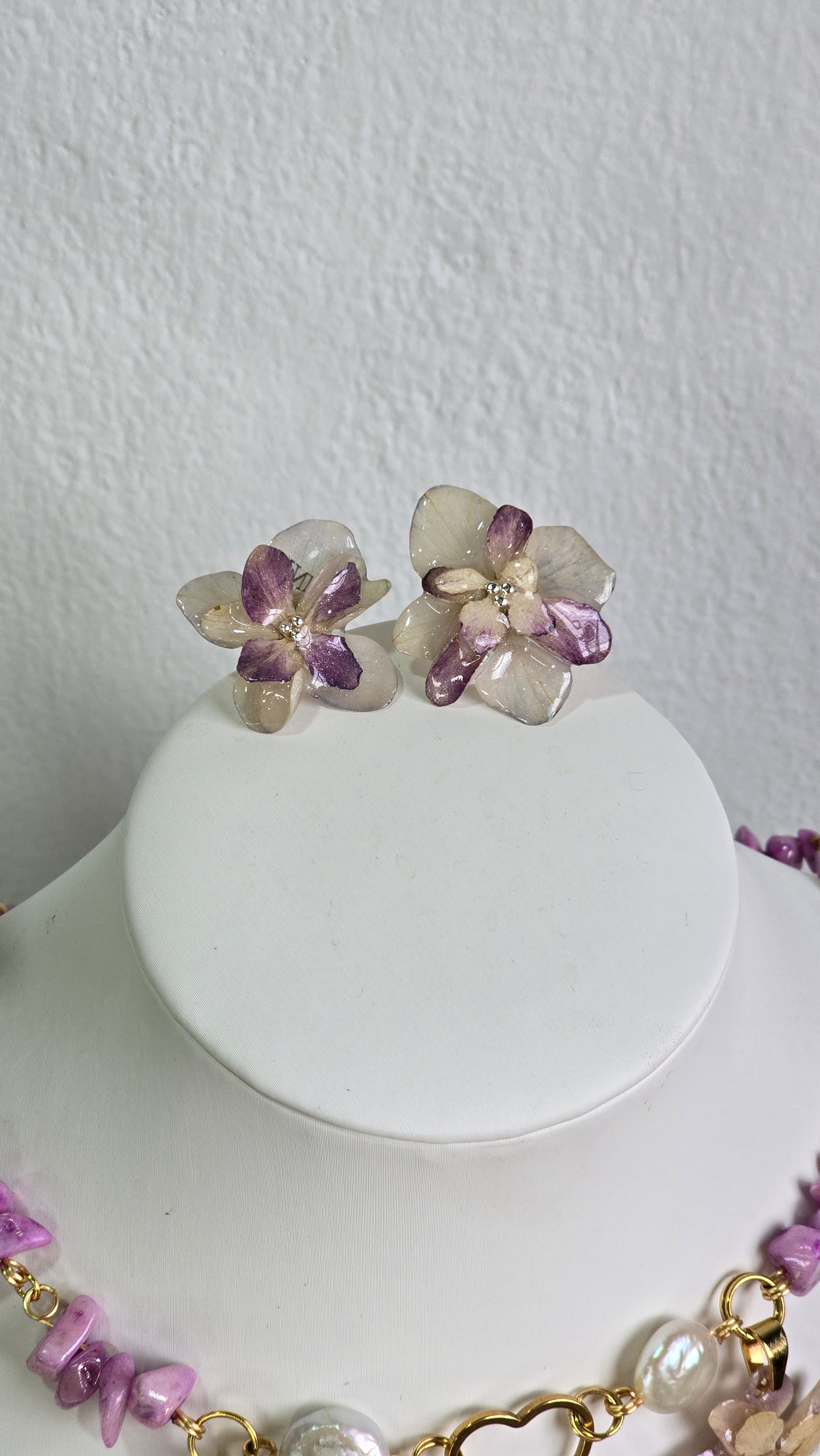 Conjunto de 3 piezas: Collar, aretes y anillo con Hortensias reales, preservadas en resina.